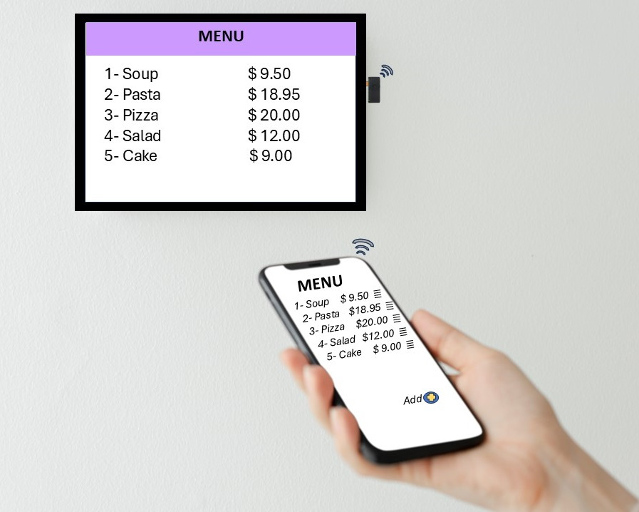 Since it establishes its own wireless network, a mobile phone can connect to it directly. So the menu on the screen can be manipulated instantly, e.g. add or remove menu item, update price, revise item name.