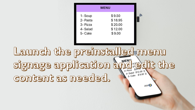 Since it works stand-alone without cloud hosting, just a screen with an HDMI port is enough to have a signage spot at the desired location and show the menu price list that sways in case it is larger than the screen size.