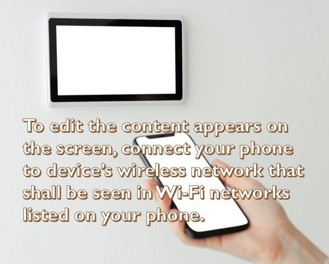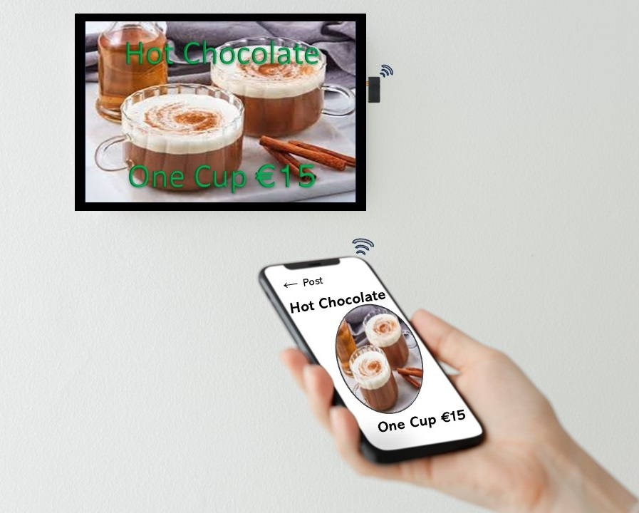 Since it establishes its own wireless network, a mobile phone can connect to it directly. So posters of desired items can be auto prepared by the app and showed on the display instantly, i.e. take photo of an item by the app, fill the data, and it is casted!