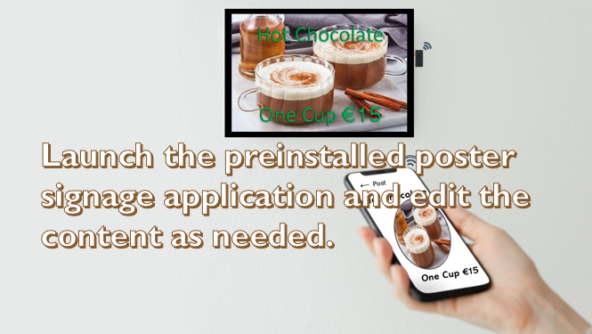 To start using Anyscreen Poster Signage, attach it to the desired display. Then download and install the application on your mobile phone, and connect to the device's wireless network. Launch the application, compose menu posters and send to screen. The mobile application package file for Android Phones is available on download page. IoS version is not available at the moment. The application is featured with quick functions with very simple user interface; Take photo, edit tags and post or delete posters.